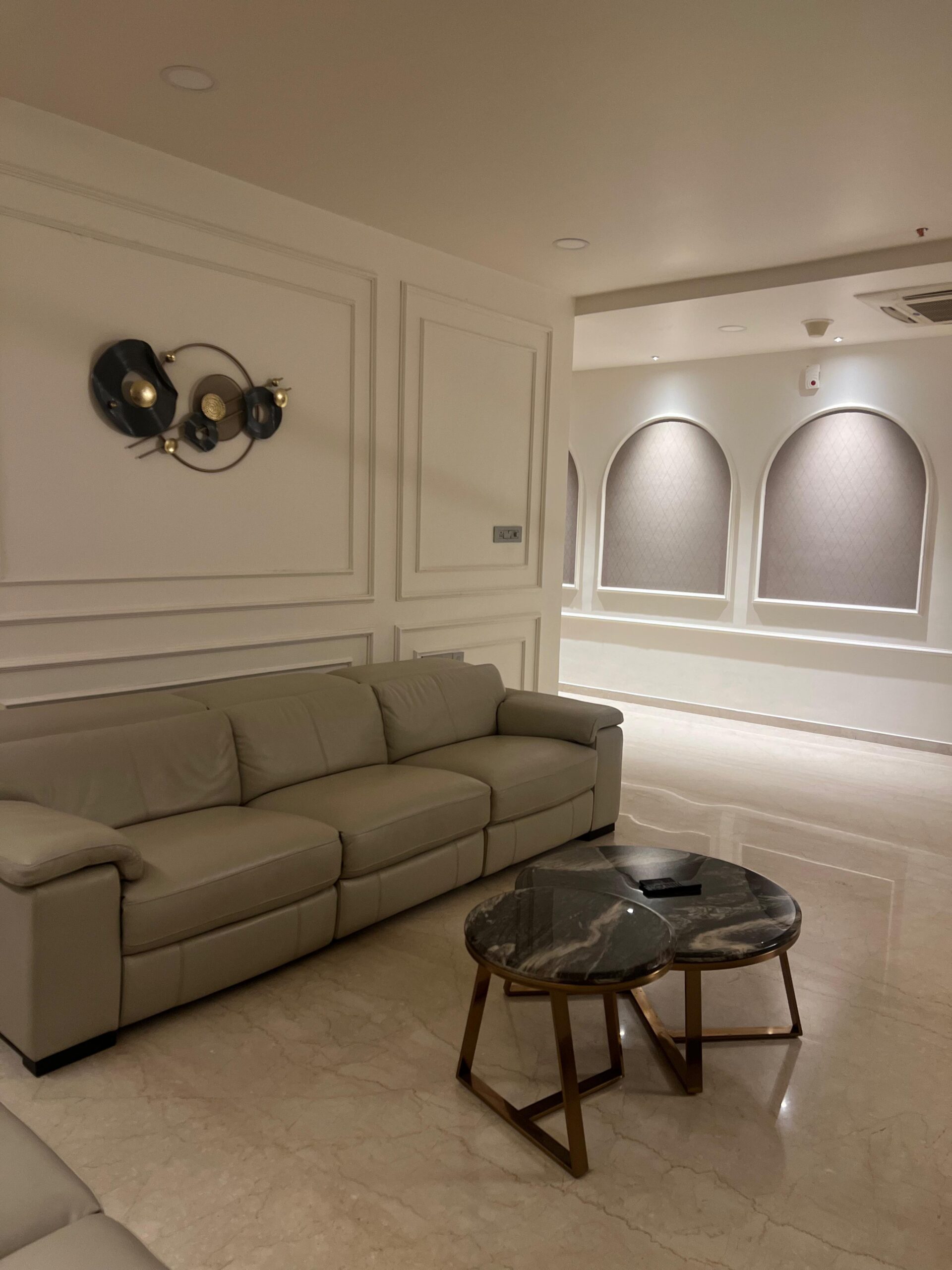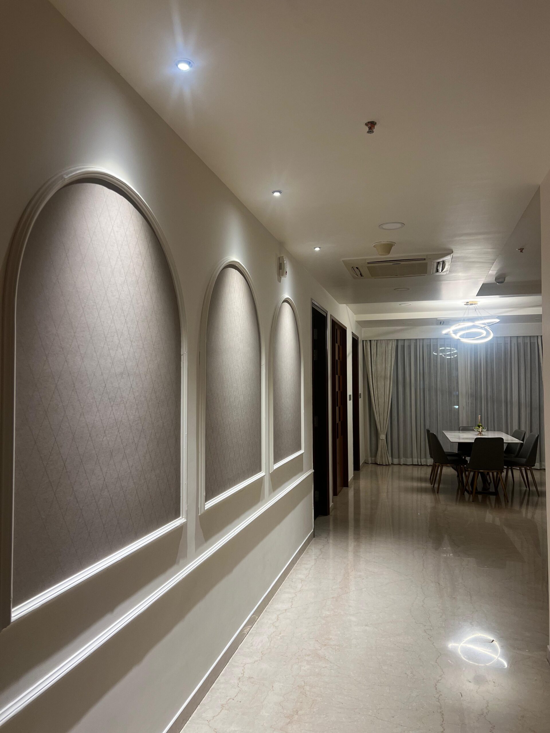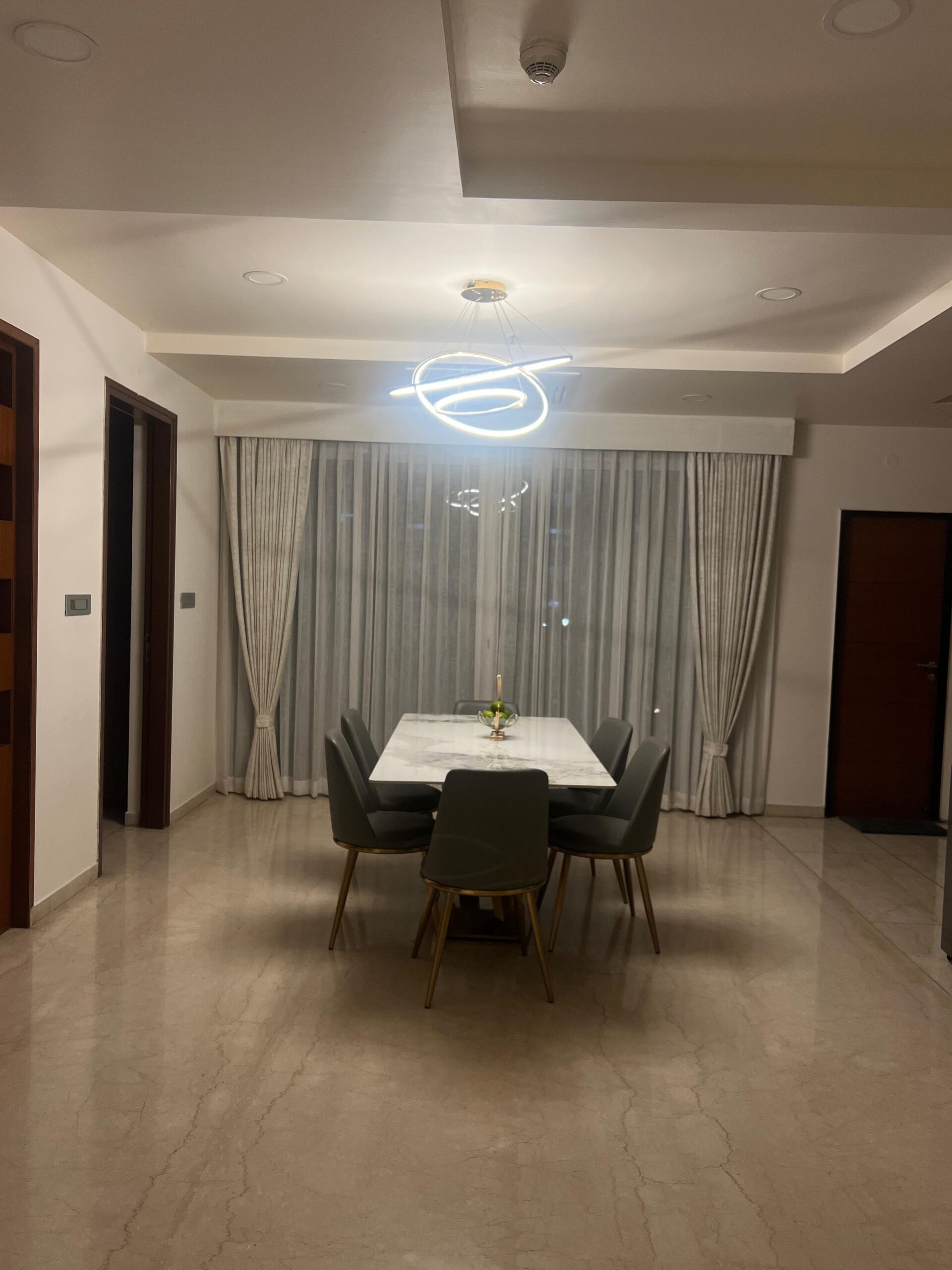 The walls feature smooth finishes and discreet panel moldings, adding depth and a hint of classic sophistication to the clean-lined layout. Overhead, a thoughtfully layered ceiling design integrates recessed lighting and cove illumination, bathing the interiors in a warm, ambient glow. A striking LED chandelier acts as both a sculptural element and a modern centerpiece.