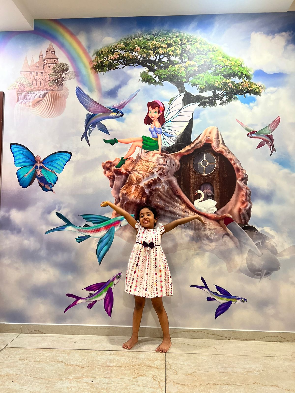 This residence at My Home Bhooja reflects a refined modern aesthetic, where every element is purposefully selected to foster a serene and elegant environment. The foundation of the home is set with polished beige marble flooring, which enhances the sense of openness and amplifies natural light, bringing in a soft, luminous quality. The walls, finished in a soft, textured white plaster, enhance the space’s serene Mediterranean character. Carefully placed artistic blue ceramic plates and witty signage like “Be strong, I whisper to my coffee…” inject personality and a touch of humor.